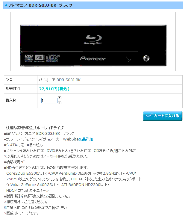 上から、商品名、ドライブの種類、メーカー、接続規格、ベゼルの色、読み書きの詳細、納期、動作環境、製品保証となります。